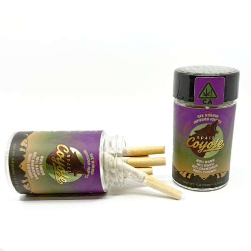 click to enlargeSpace Coyote Diamond Coated Infused Pre-Rolled Cones - Hybrid Diamond Coated Hyrid Infused Pre-Rolled Cones6pk- 1/2g Cones$8Each jar contains 6 half gram prerolls that have been infused with hash and then coated in diamonds! Inside each Space Coyote is a blend of quality full bud with delicious concentrates from top notch California extract brands. Their infused joints are super smooth, provide an incredible high, and most importantly deliver flavor profiles you’ve been missing in regular joints. They pride themselves on giving you an excellent experience from smoke to high.Quantity: Add to CartOther Flavors Available:Hybrid Infused Pre-Rolled ConesIndica Infused Pre-Rolled Cones